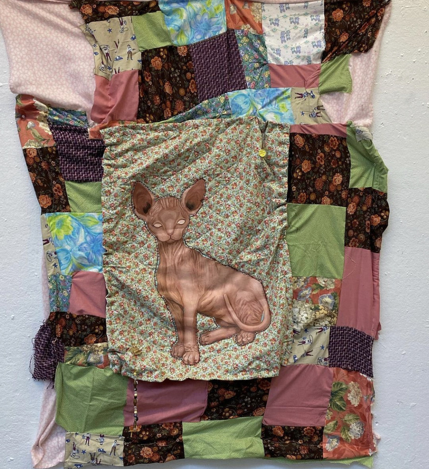 kitten around (2021), oil, collage, and fibers, 5ft x 4ft